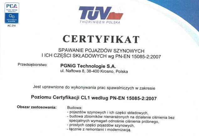 We are proud that PGNiG Technologie S.A.  in the Mining Infrastructure Production Department can boast of a positive result of the completed audit, the purpose of which was to check the requirements of the implemented new standard PN-EN 15085 “Railway – Welding of rail vehicles and their components”.